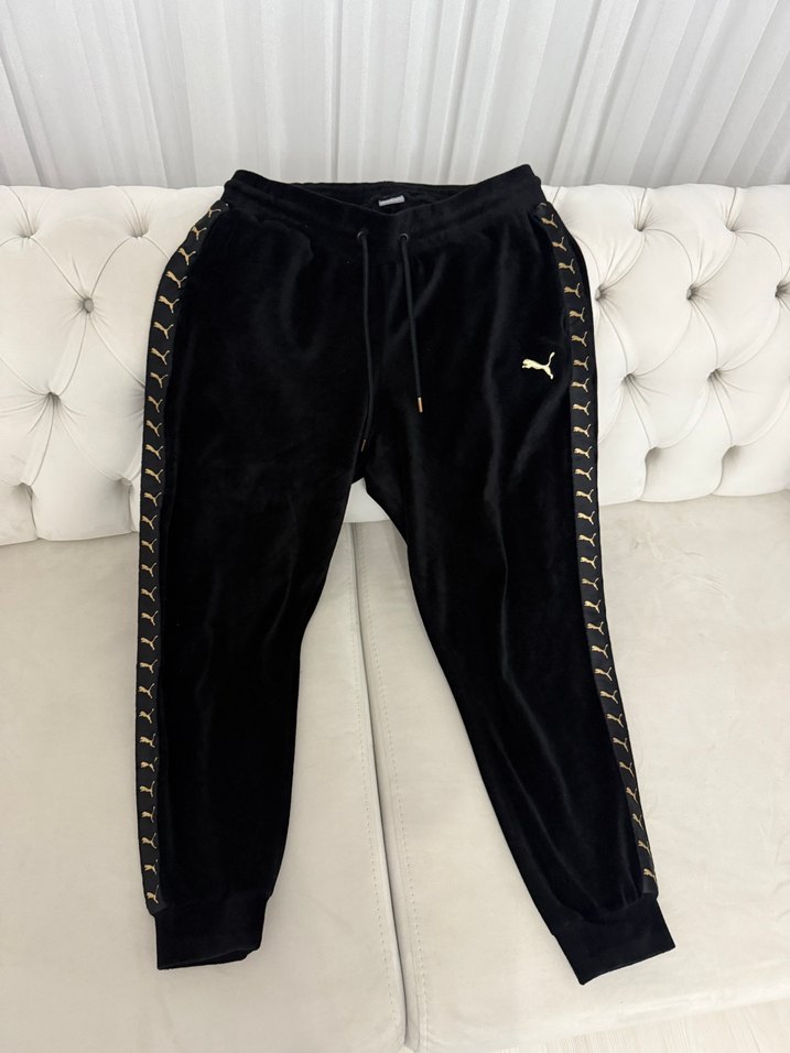 Siyah renkte, kadife kumaştan yapılmış, dar kesim ve midi boy Puma eşofman altı. Fermuarlı cepleri ve yan tarafında markalı şerit detayı bulunur. Spor ve şık görünümlü. Sorunsuz temiz
