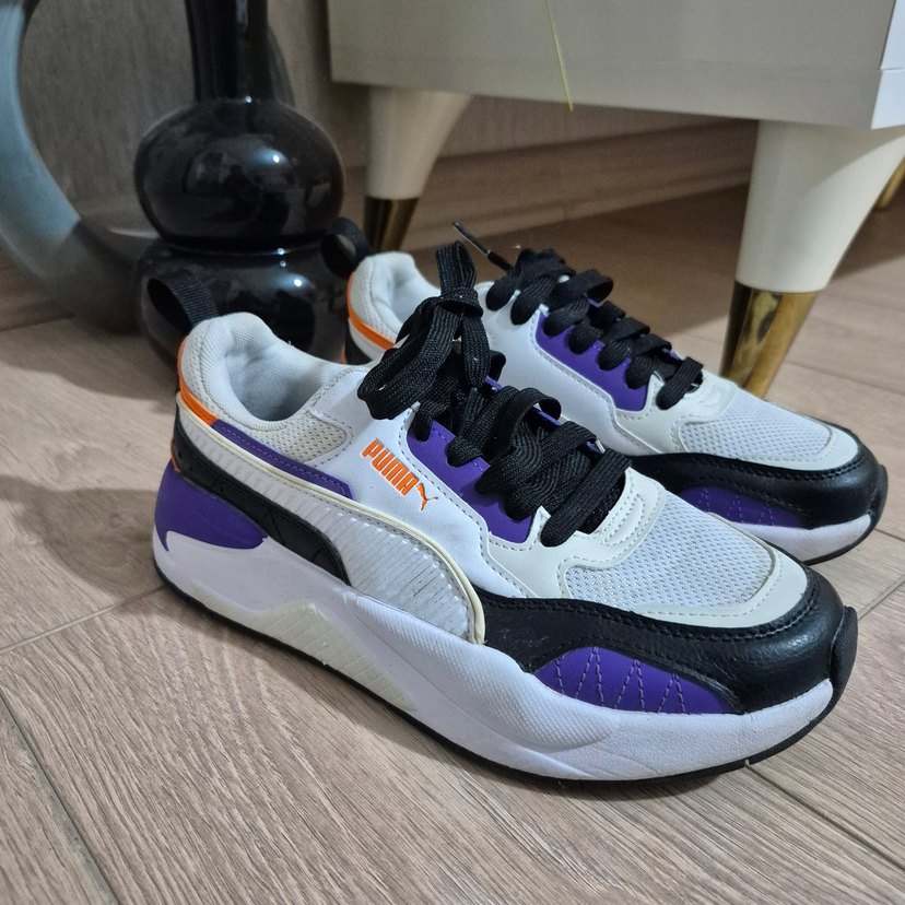 Puma kadın spor ayakkabı, platform topuklu, cırt cırtlı ve koyu mor batik desenlidir. Spor ve şık günlük kullanım için uygundur.