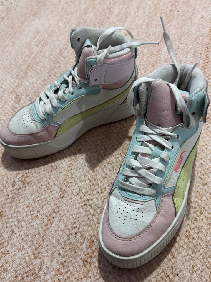 Puma marka, pembe pastel tonlarda, bağcıklı ve cırt cırtlı, lastik tabanlı kadın spor ayakkabısı. Wedge topuklu, tie-dye desenli, sokak stiline uygun.