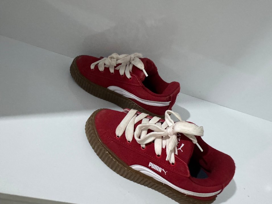Kırmızı Puma spor ayakkabılar, elastik özellikli ve platform topuklu. Kauçuk taban dayanıklılık ve konfor sağlar.