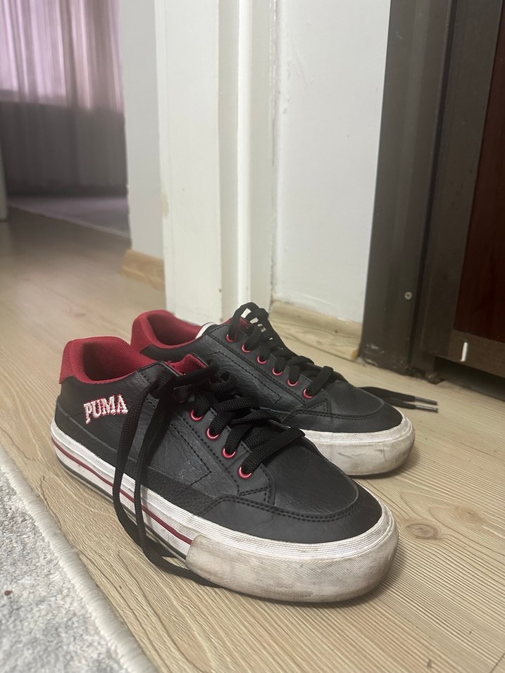 Puma marka, kırmızı siyah renklerde, baskılı ve bağcıklı kadın spor ayakkabısı. Düz tabanlı kauçuk tabanıyla sokak stiline uygun rock punk havası verir.