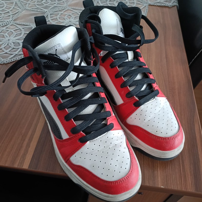 Erkekler için siyah bağcıklı, kırmızı beyaz renklerde spor ayakkabı. Athleisure tarzına uygun, dayanıklı ve şık bağcıklar. ikisini de hiçbir yırtığı söküğü yoktur Orijinal Puma markadır