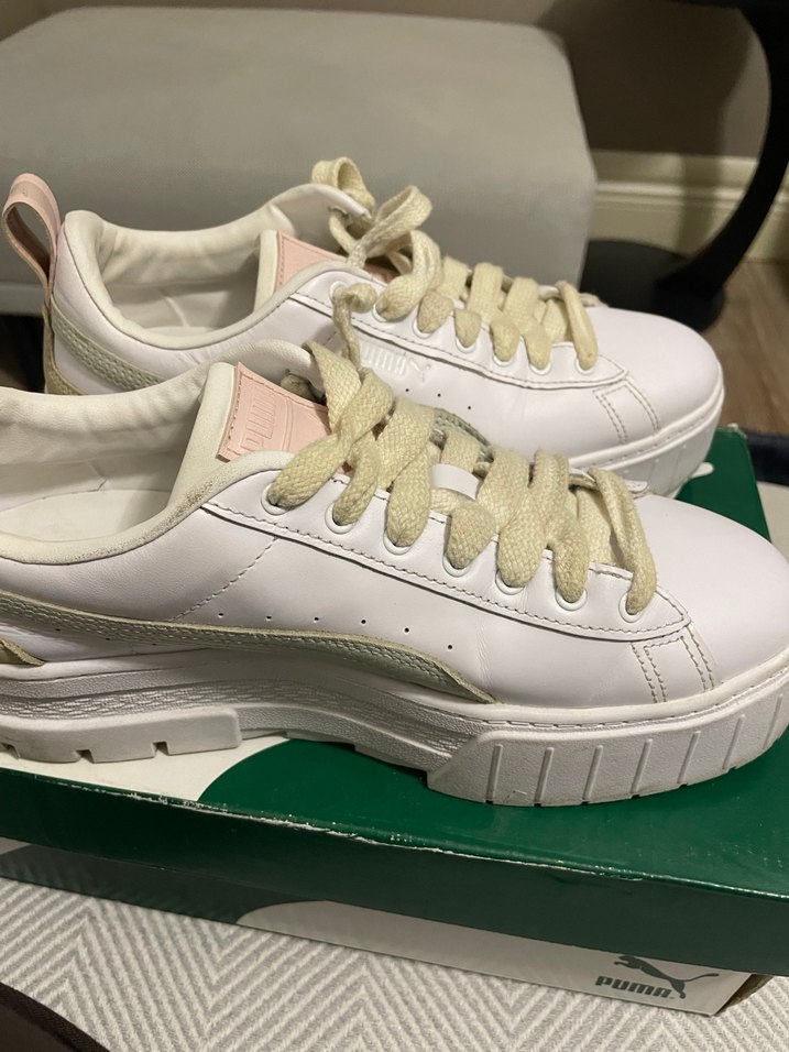 Beyaz renkte, platform topuklu ve bağcıklı kadın spor ayakkabısı. Dayanıklı kauçuk malzemeden üretilmiş, pastel detaylı ve desen içermeyen tasarıma sahip. Ufak bir soyulması var görünmüyor 3-4 kere giyildi