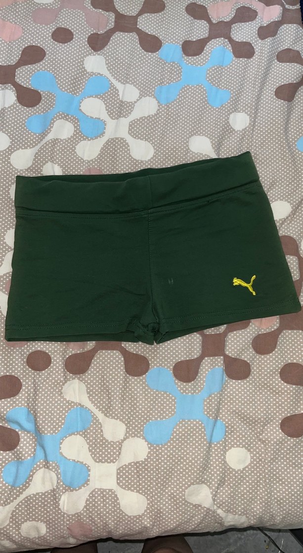 Kadınlar için elastik bel bantlı, yeşil mikro şort. Pürüzsüz sentetik kumaştan, spor ve sokak stiline uygun, cesur athleisure tasarım. puma mikro şort s m l beden uyumlu
