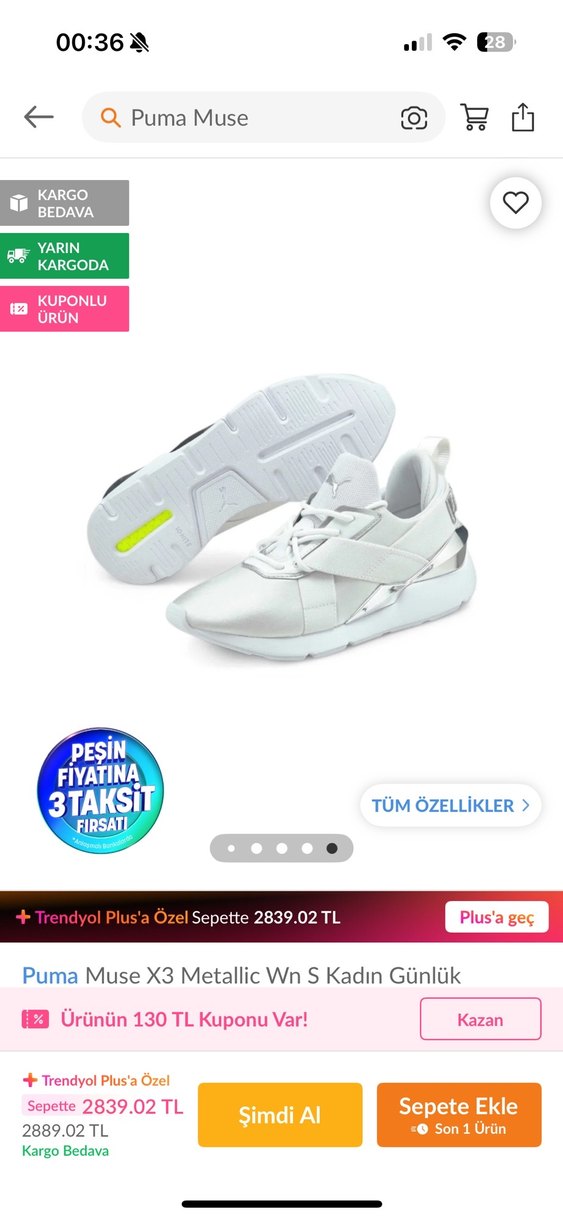 Puma Muse X3 Metallic beyaz spor ayakkabı Hiç kullanılmadı metalik yerleri rose gold oldukça rahat