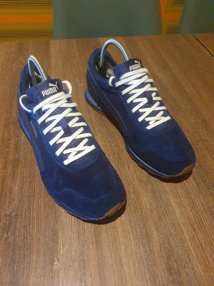 Puma marka, koyu lacivert renkte, beyaz bağcıklı erkek spor ayakkabısı, athleisure ve sokak stili için uygun .