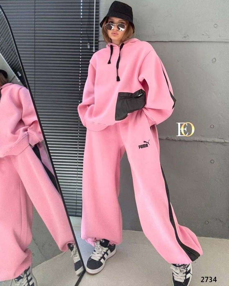 Puma markalı, pastel pembe ve siyah detaylı, kapüşonlu ve uzun kollu, yumuşak kumaştan bol kesim kadın eşofman takımı. Spor ve rahat şıklık sunar. ♀️