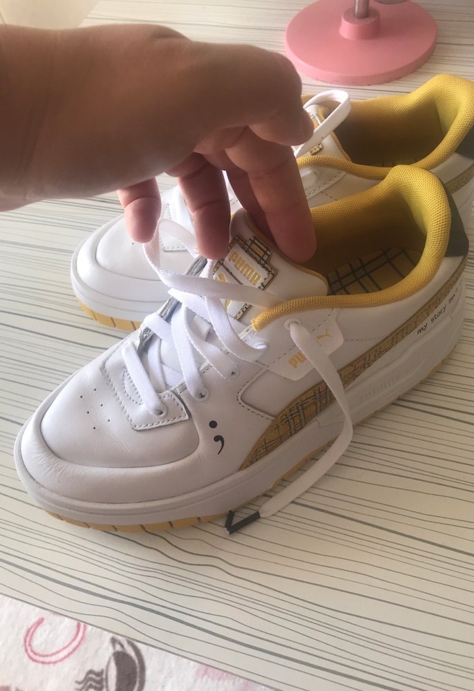 Orjinal Puma 39 numara bi kaç kez denemek için giyildi sadece sarı detaylı, baskılı desenli kadın spor ayakkabısı. spor ve sokak stiline uygun.