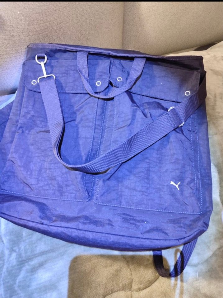 Mavi parlak renkte, geniş kullanımlı, desen içermeyen evrak çantası. Çeşitli tutma kulpları ve küçük logo detayı bulunur.
