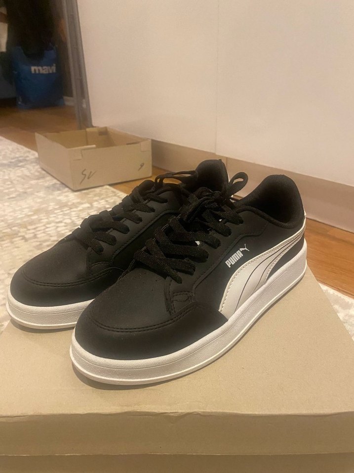 Puma siyah kadın spor ayakkabısı, beyaz şerit detaylı, düz tabanlı ve cırt cırtlıdır. Spor ve günlük kullanıma uygundur.