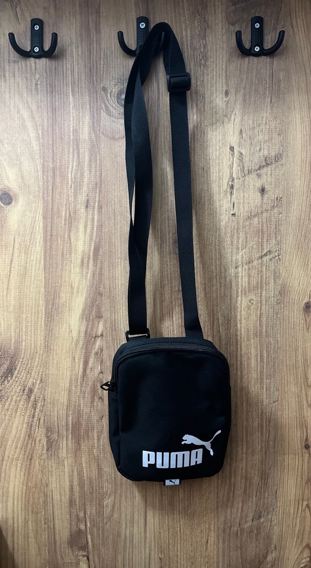 Ayarlanabilir tokalı kayışa ve baskılı logoya sahip siyah Puma erkek omuz çantası, trendi gündelik tarz için uygun.