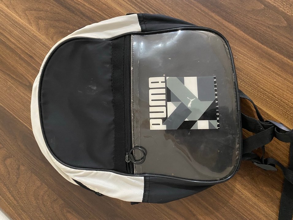 Puma siyah ve gri renkte, önünde fermuarlı cep ve şeffaf logo paneli bulunur.