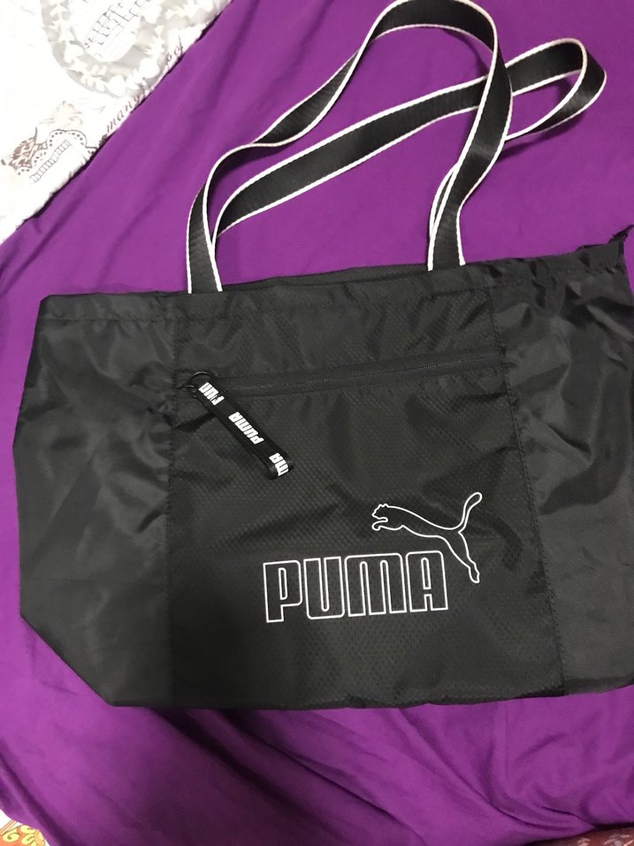 Puma marka, fermuarlı cepli, baskılı logolu siyah kadın spor çantası. Sentetik kumaştan, sokak modasına uygun şık tasarım.