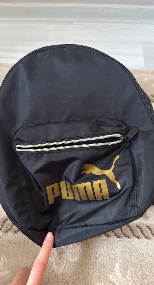 Puma siyah sırt çantası, parlak yüzey ve fermuarlı ön cep ile dikkat çeker. Spor ve sokak stili, baskılı logo ve yumuşak kumaştan üretilmiştir.