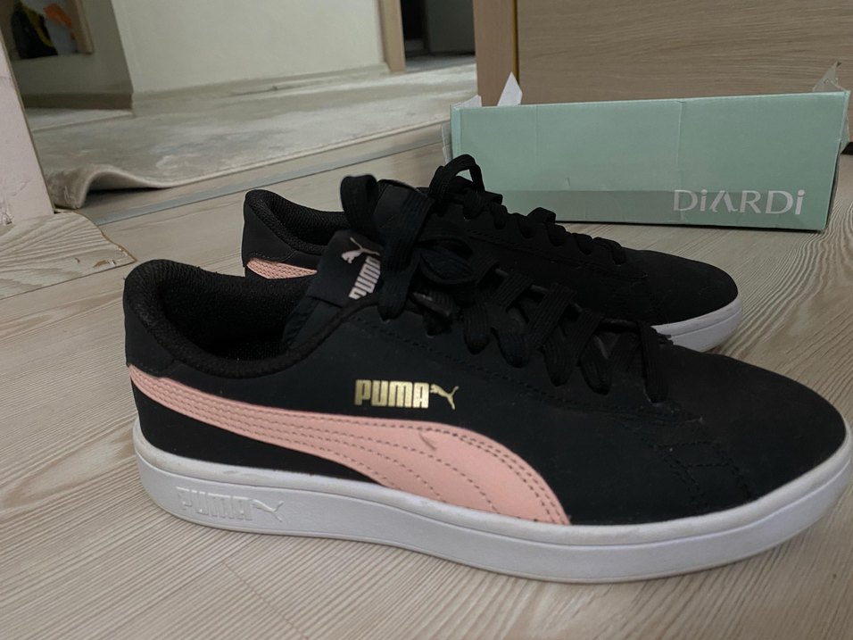 Puma markalı siyah ve pastel pembe baskılı kadın spor ayakkabısı Dışarda sadece 1 kez giyildi 37.5 yazıyor ama kalıbı dar bana olmadığı için satıyorum Orjinaldir zaten qr kod da fotoğraflarda görünüyor. Allah aşkına alacaksanız yazın ve indirim istemeyin zaten uygun fiyatta