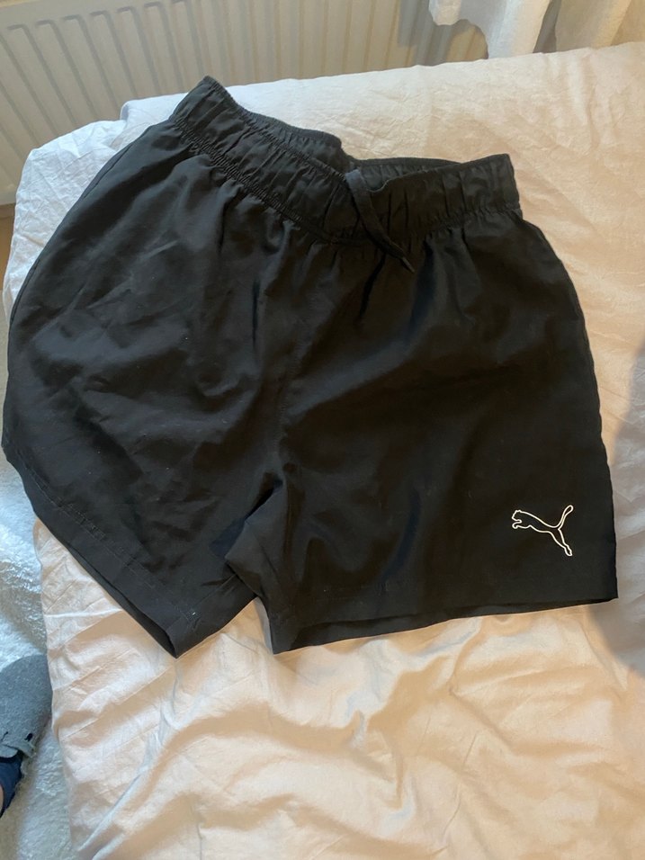 Puma markalı, siyah renkte, rahat kesim ve ipeksi kumaştan üretilmiş spor ve günlük kullanım için uygun şort.