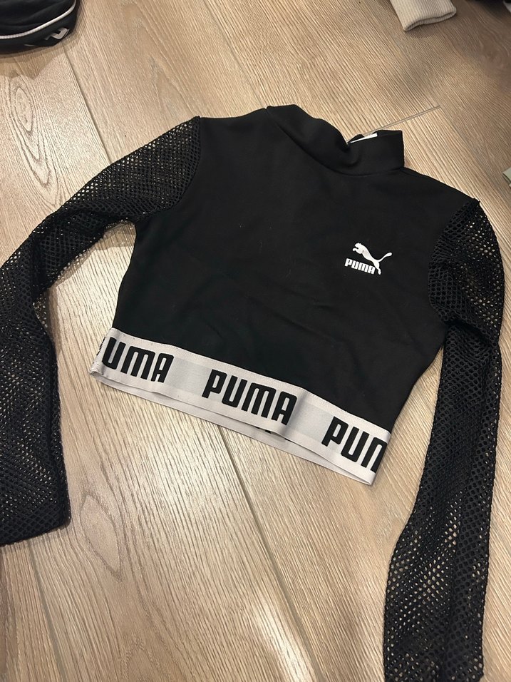 Siyah, uzun file kollu, yüksek yakalı ve cırt cırtlı detaylı, Puma baskılı bantlı, dar kesim crop top. Spor şıklığı yansıtır.