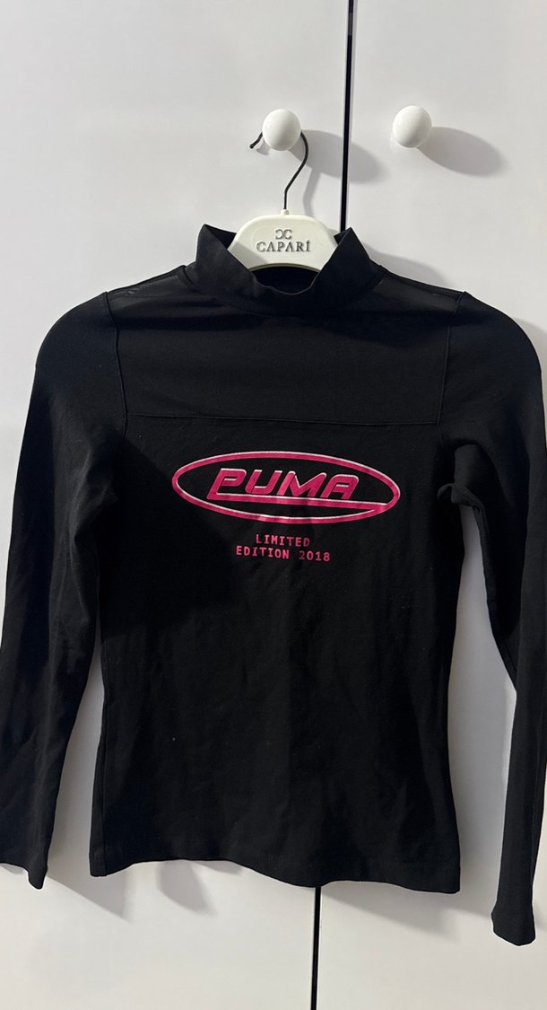 Puma markalı, uzun kollu, bisiklet yaka, baskılı, elastik detaylı, siyah tisort. Rahat ve şık bir görünüm sunar.