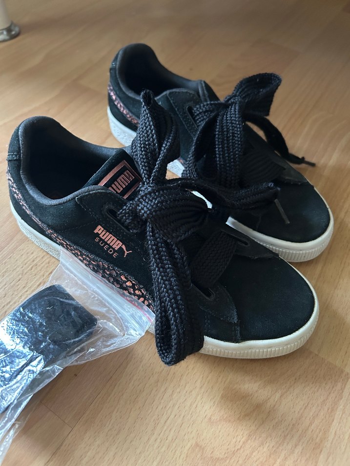 Siyah Puma spor ayakkabı, yılan derisi desenli, düz kauçuk tabanlı ve cırt cırtlı. Sokak stili ve spor için uygun.