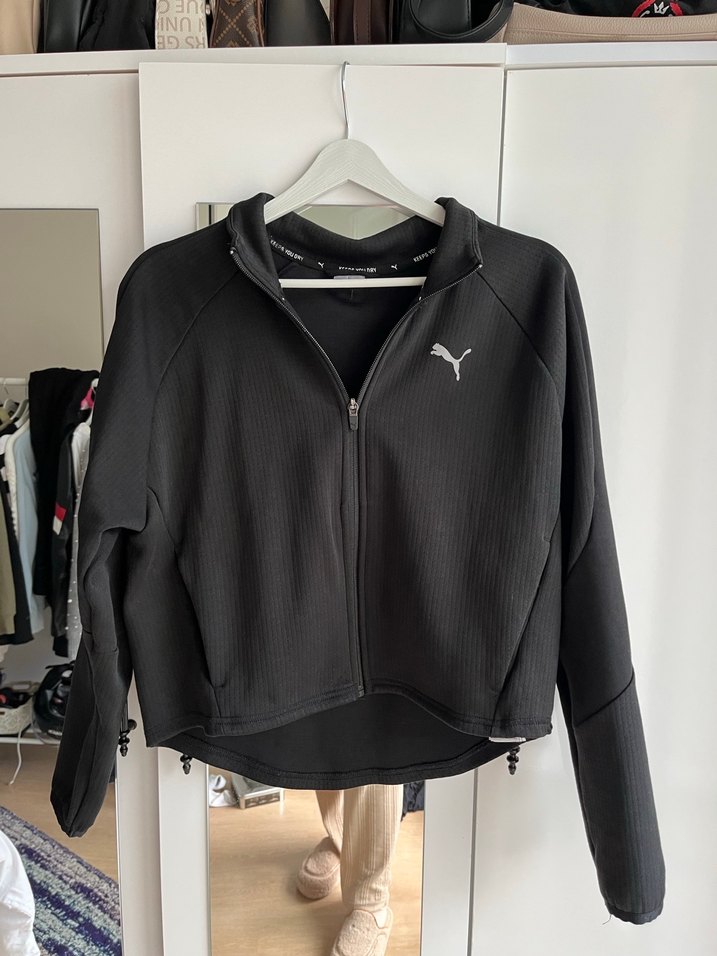 Puma markalı, siyah, yüksek yakalı ve fermuarlı, uzun kollu kadın ceket. Yumuşak ve sıcak kumaştan, normal uzunlukta midi kesimle sportif tarz için uygun.