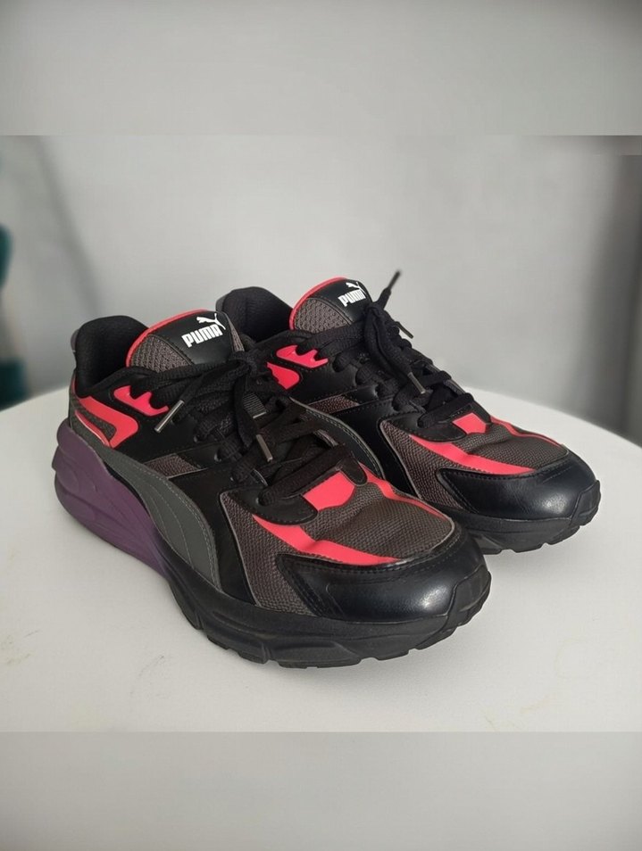 Puma marka, bağcıklı, erkek spor ayakkabısı. Siyah ve koyu pembe renklerde, sokak tarzı ve spor için uygundur.