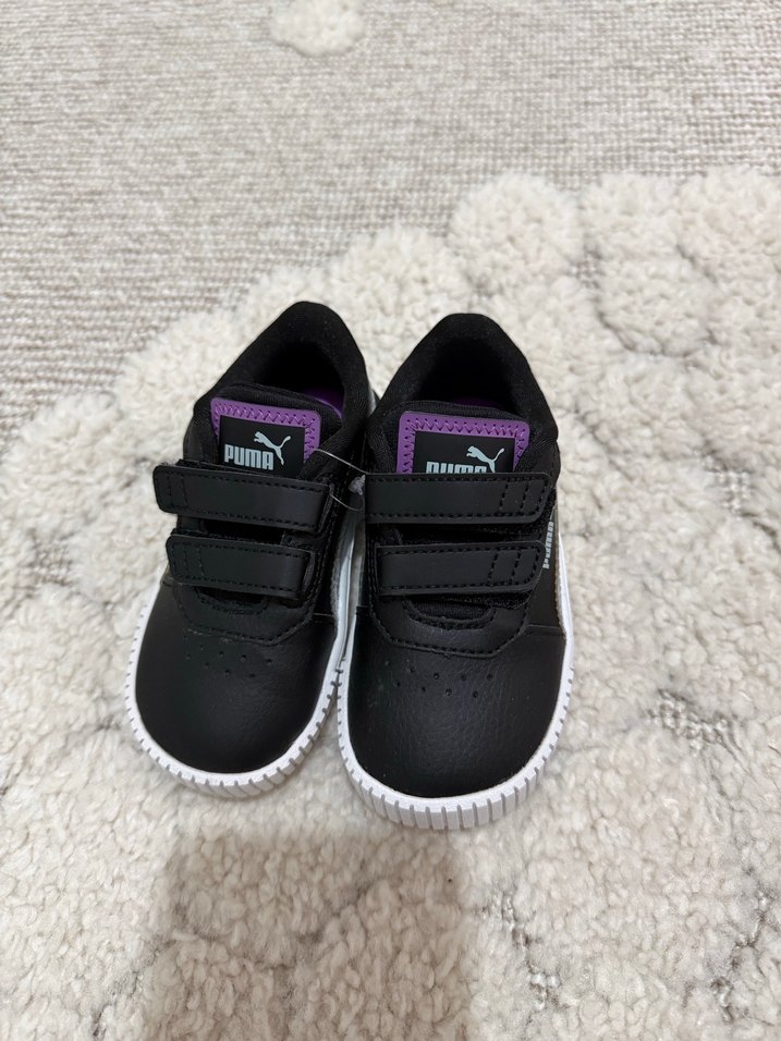 Hiç kullanılmadı etiketli Erkek çocuklar için koyu mor ve siyah renkli, baskılı desenli spor ayakkabılar. Kauçuk tabanlı ve kolay kapanan Velcro bantlıdır.