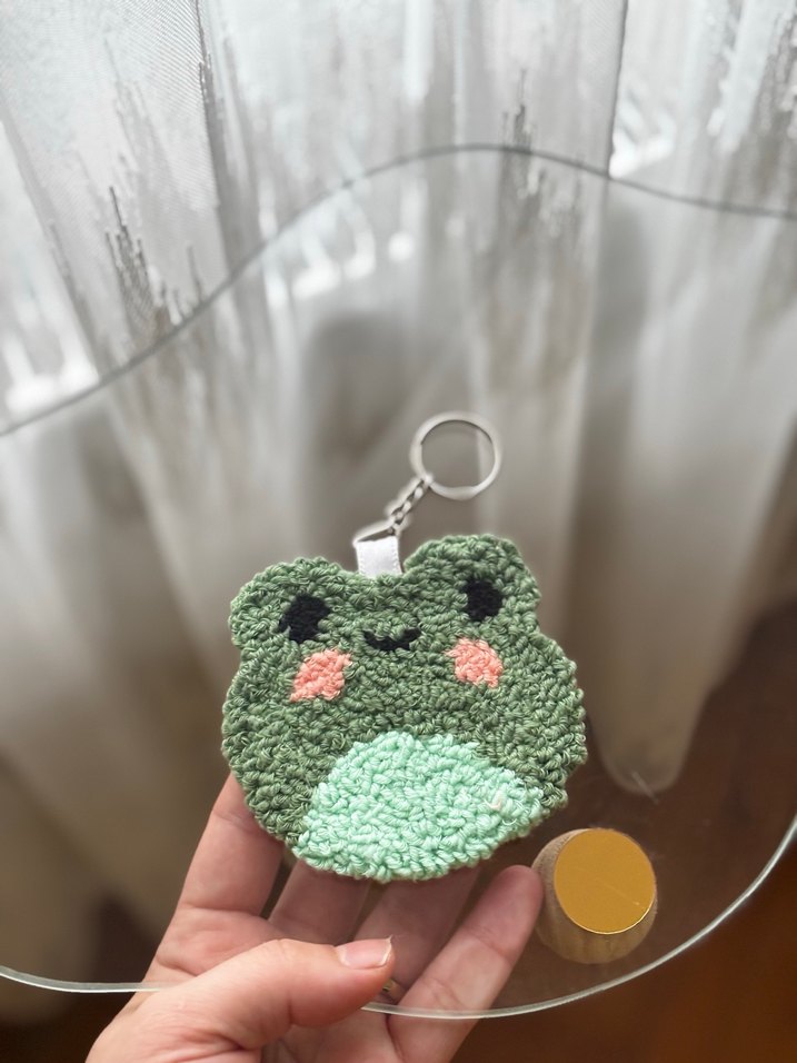 Pastel yeşil örgüden yapılmış, gülen kurbağa şeklinde rahat ve bohem tarzda anahtarlık . El emeğidir Hediye paketi ve jelatinli gönderim ❤️