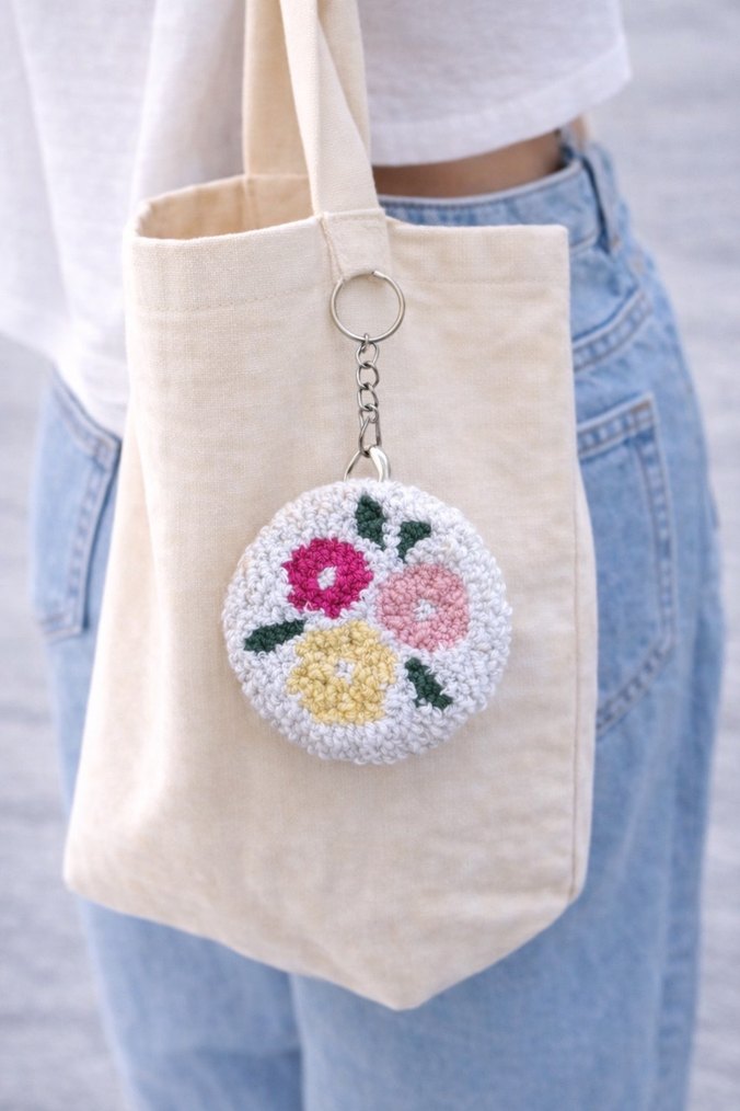Pastel renklerde boncuk işlemeli, yuvarlak çiçek desenli minimalist bohem tarzda anahtarlık. Çok renkli nakış ile retro hippie havası katar.