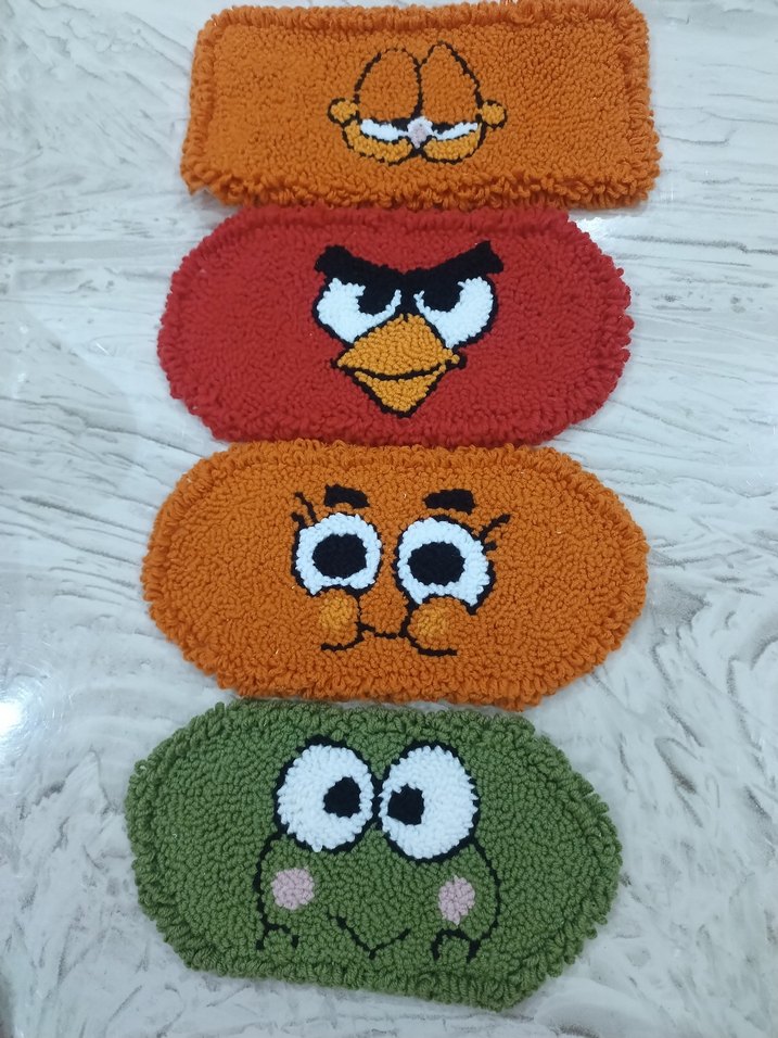 Turuncu, kırmızı ve yeşil tonlarda çizgi film karakteri yüzleri içeren renkli çocuk halısı seti. Her halı yumuşak dokulu ve eğlenceli tasarımlı. istenilen renk ve modele göre özel tasarlanir adet fiyatidir