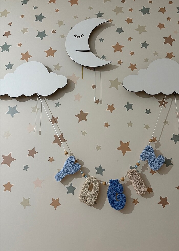 Ürün sipariş üzerine yapılmıştır. İstenilen isim istenilen renkte yapılır, isterseniz figürde ekleyebilirsiniz. Aralarına boncukta koydurabilirsiniz. Arka tarafı keçelidir. Harf/figür fiyatı 100 tl dir. Kendi el işimdir. Sipariş için yeni ilan açtırınız.