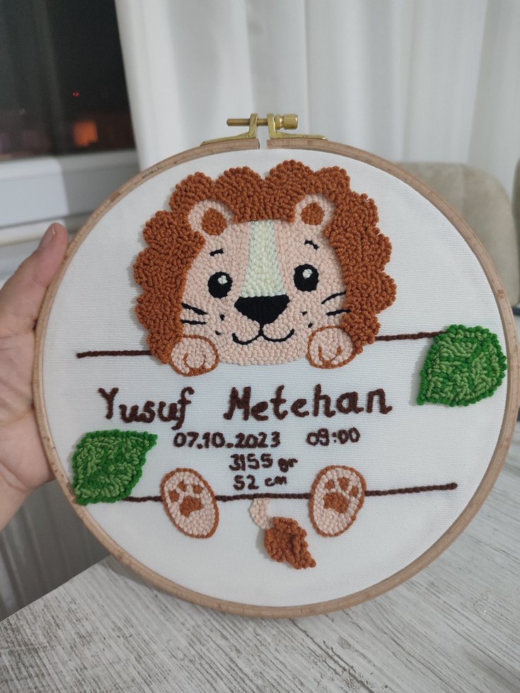 İşlemeli aslan figürlü, isim, tarih, saat, kilo ve boy bilgileri bulunan bebek panosu.takı yastığı fiyatları değişmektedir isteğe bağlı yapıyorum
