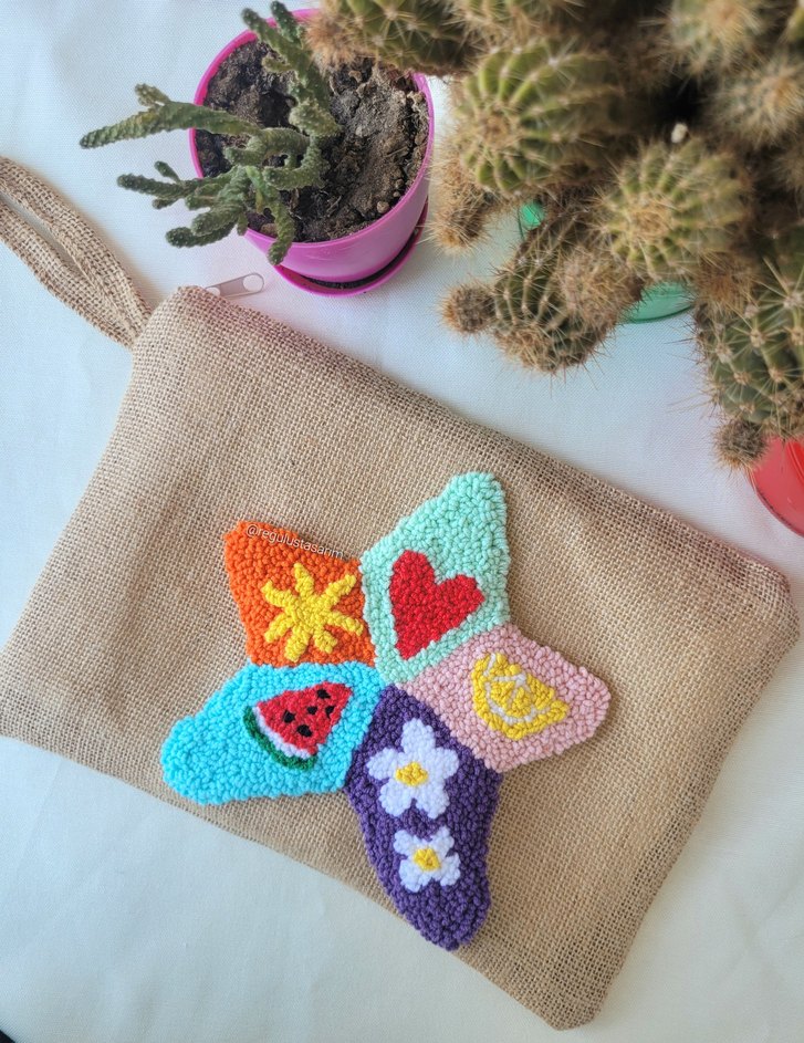 25×19 ölçüsünde punch işlemeli jüt kumaş clutch çanta. El emeği olarak kişiye özel tasarlanmaktadır.