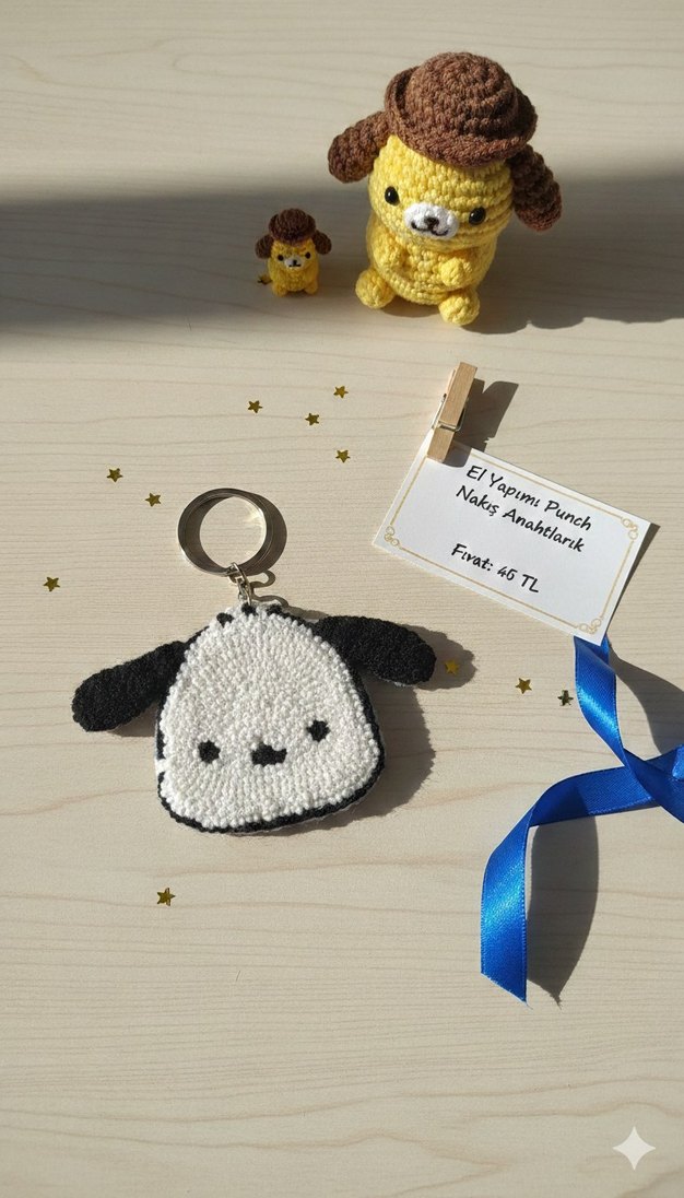 Siyah ve beyaz renklerde, köpek yüzü şeklinde punch işlemeli anahtarlık. Yumuşak dokulu.