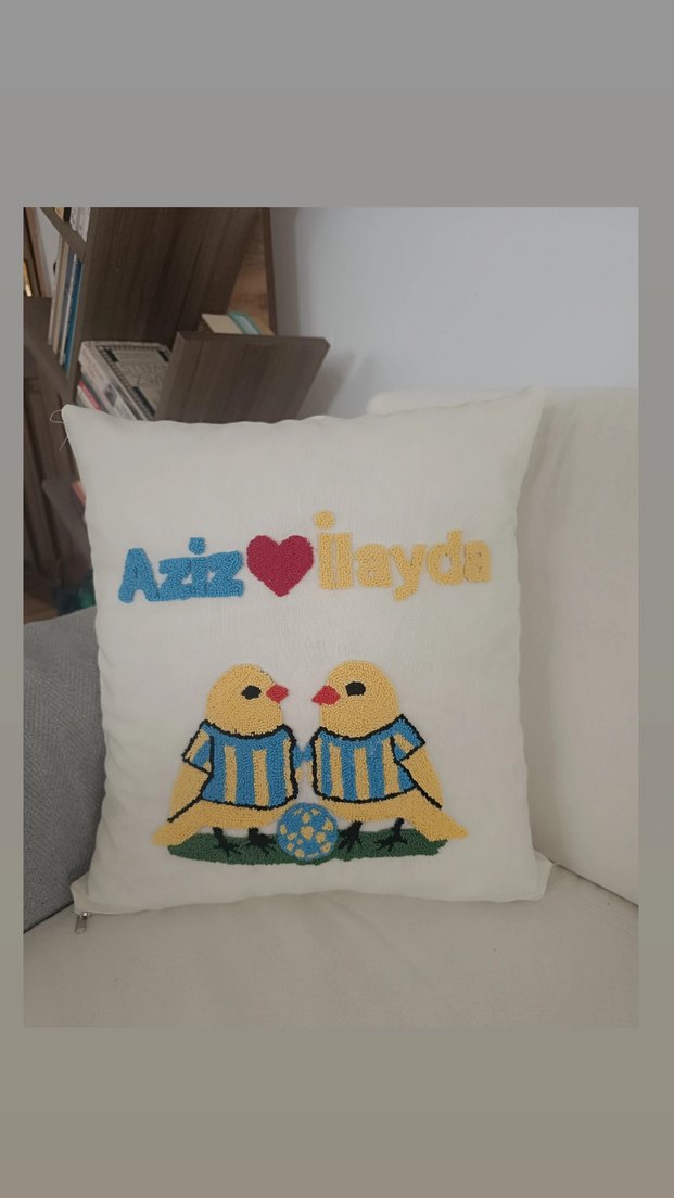 Yumuşak kumaş üzerine punch işlemeli , pastel mavi renkte iki kuş ve isimler bulunan geleneksel tarzda dekoratif yastık. ️ Kişiye özel işleme yapılır İnstagram @gokcepunchatelier