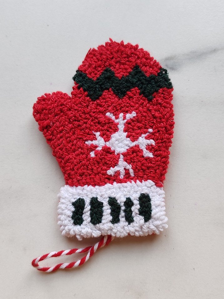 Punch Nakışlı eldiven çm ağacı süsü ; kar tanesi ve zigzag desenleri, çizgili manşet ve askı ipi ile tamamlanmıştır. ❄️