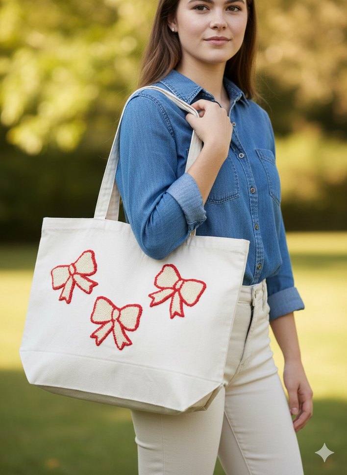 Pamuk kumaştan, nakışlı fiyonk desenli beyaz omuz çantası, günlük rahat kullanım için uygundur. Sokak modasına uyum sağlar.