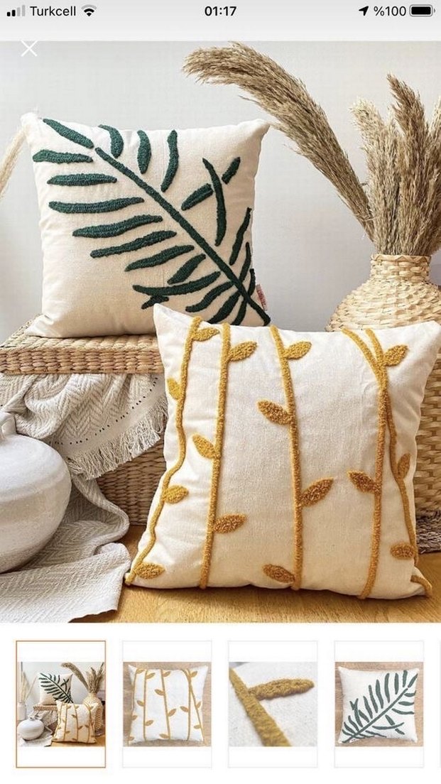 Nakışlı yaprak ve dal desenlerine sahip bohem tarzda, açık beyaz dokulu yastık kılıfları. Yumuşak dokusu ile doğal bir hava katar.