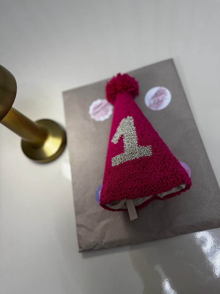 Nakışlı 1 rakamı detaylı, pembe renkli çocuk yaş şapkası. örgü dokusu ve tepede ponpon ile tamamlanmıştır.