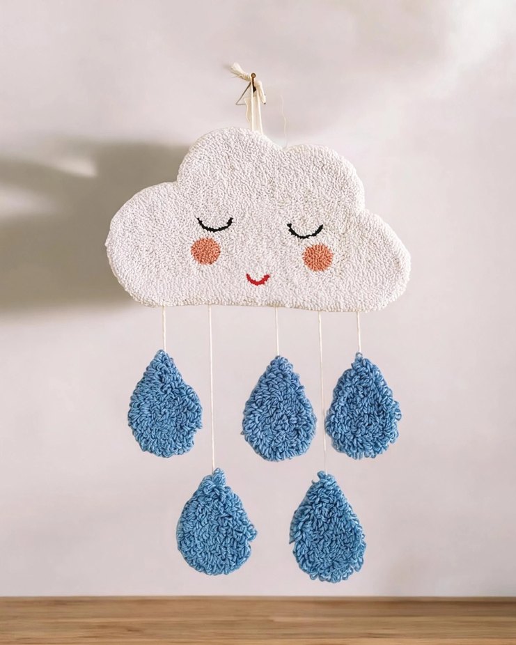 Nakışlı yüz detaylarına sahip pastel mavi örme bulut ve yağmur damlalarından oluşan çocuk odası dekoru. ☁️