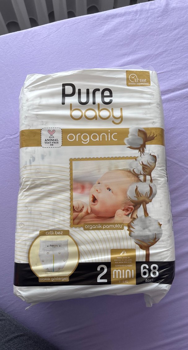 Pure Baby organik pamuklu bebek bezi, 2 numara mini, 68 adet. Islaklık göstergesi ve hayvanlar üzerinde test edilmemiştir. Yumuşak organik pamuk kumaş içerir.