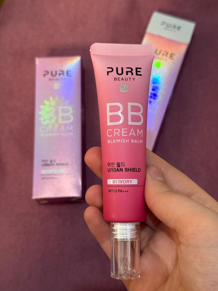Pure Beauty BB Krem 01 Ivory, SPF50 PA+++ korumalı, leke kapatıcı özellikli pastel pembe ambalajda. Ürün ithaldir Tane fiyatıdır