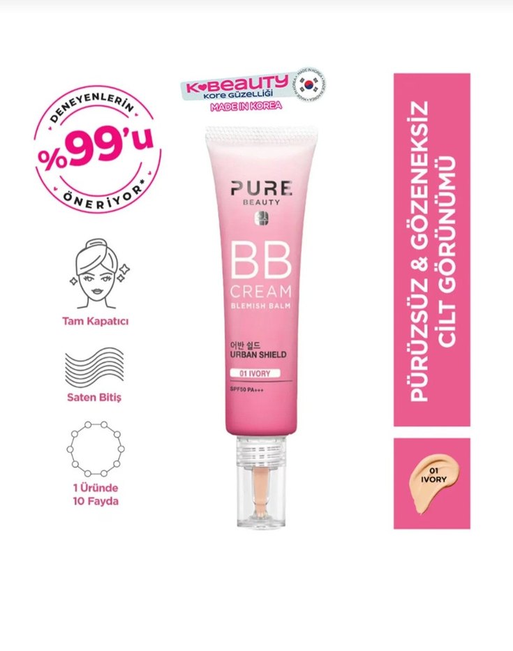 Pure Beauty BB Krem, tam kapatıcı ve saten bitiş sunar. 1 üründe 10 fayda sağlar, pürüzsüz ve gözeneksiz cilt görünümü verir. %99 kullanıcı önerisi, 01 Ivory tonu. Sıfır ürün