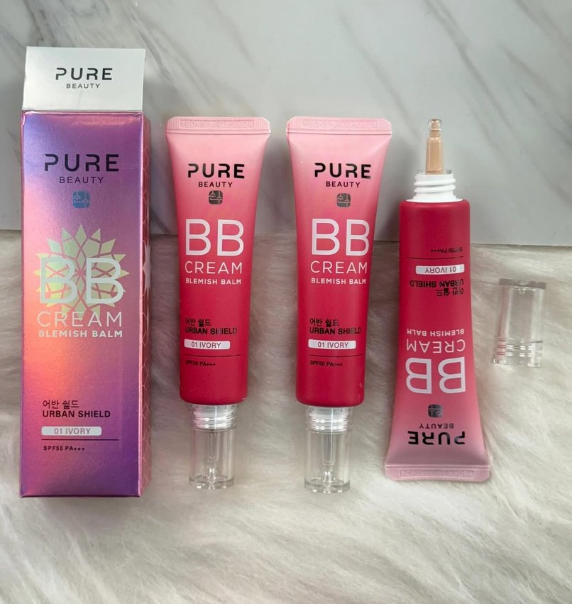 Pure Beauty BB Cream, pastel pembe ambalajda, leke karşıtı koruma ve urban shield özellikli. Ton: 01 Ivory. Yumuşak dokulu, doğal bitişli krem.