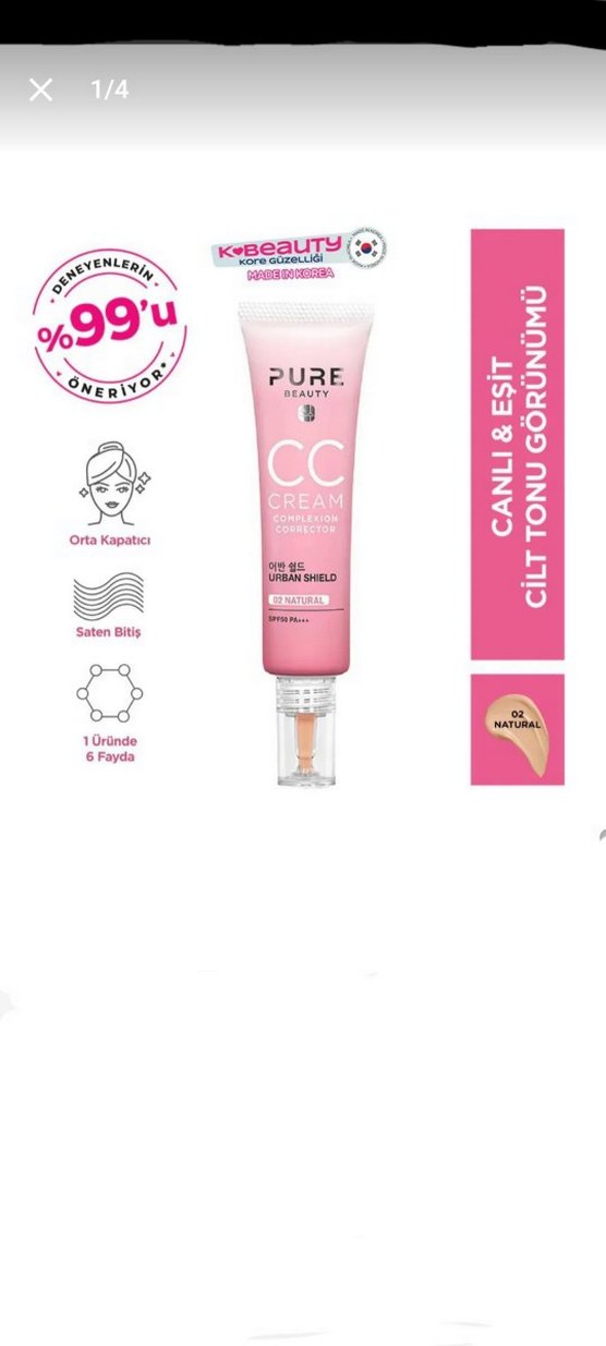 Pure Beauty CC Cream, orta kapatıcı ve saten bitiş sağlar. Bir üründe 6 fayda sunar, cilde canlı ve eşit tonlu görünüm verir. Sadece 1 kere denendi cilt tonuma uymadı.Kore markasıdır.