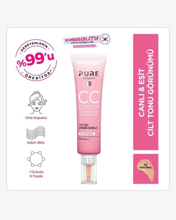 Pure Beauty CC krem, orta kapatıcılık ve saten bitiş sağlar. 6 faydayı bir arada sunar, canlı ve eşit cilt tonu verir. Pastel pembe ambalajda SPF 50 içerir.