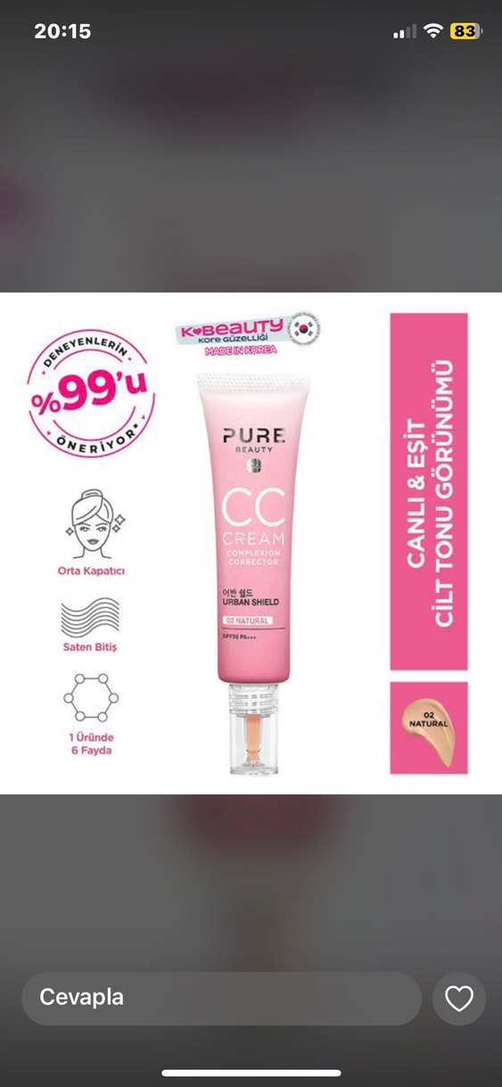 Pastel pembe Pure Beauty CC krem orta kapatıcılık ve saten bitiş sağlar. Cilt tonunu eşitler, 6 faydayı tek üründe sunar. SPF 50 ile güneş koruması içerir.