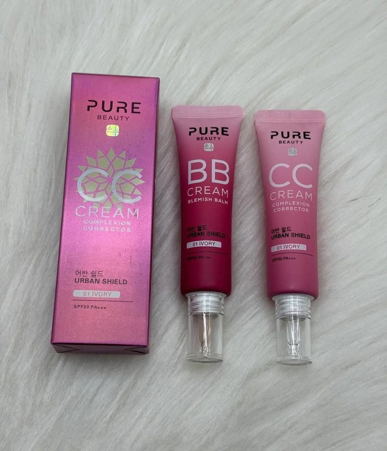Pure Beauty pembe tonlarda BB ve CC krem seti, cilt tonunu düzeltir ve SPF 50 ile şehir koruması sağlar. BB krem leke balmı, CC krem cilt düzeltici, 01 Ivory renk.