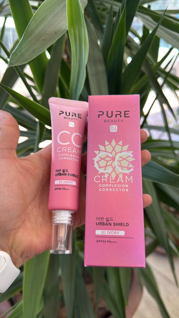 Pastel pembe renkte Pure Beauty CC Krem, 01 Ivory tonunda cilt tonu düzeltici ve SPF 50 koruma sağlar. Şehir hayatına uygun koruma sunar.