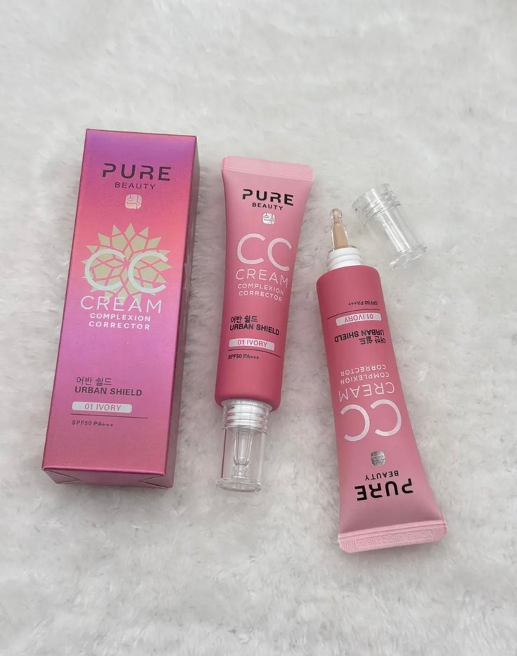 Pure Beauty pembe tonlu CC krem, cilt tonunu düzelten ve SPF koruması içeren yumuşak yapılı bir kremdir.