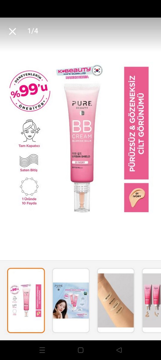 Pure Beauty pembe tonlu BB krem, tam kapatıcılık ve saten bitiş sunar. 1 üründe 10 fayda sağlar, pürüzsüz ve gözeneksiz cilt görünümü verir. %99'u öneriyor. Hiç açılmadı Trendyol Watsons satıcısından alındı isteyene SS atarım orjinal iki tane almıştım birini satıyorum